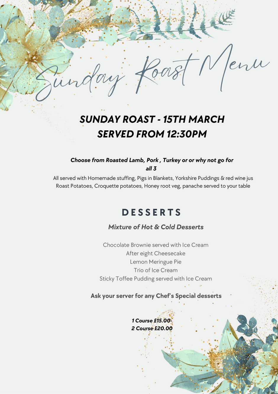 Julie and her team are offering a monthly Sunday Roast menu, therefore we're delighted to enclose a sample menu which I'm sure you will agree looks absolutely brilliant. Just keep on eye out on our Facebook page for further details.